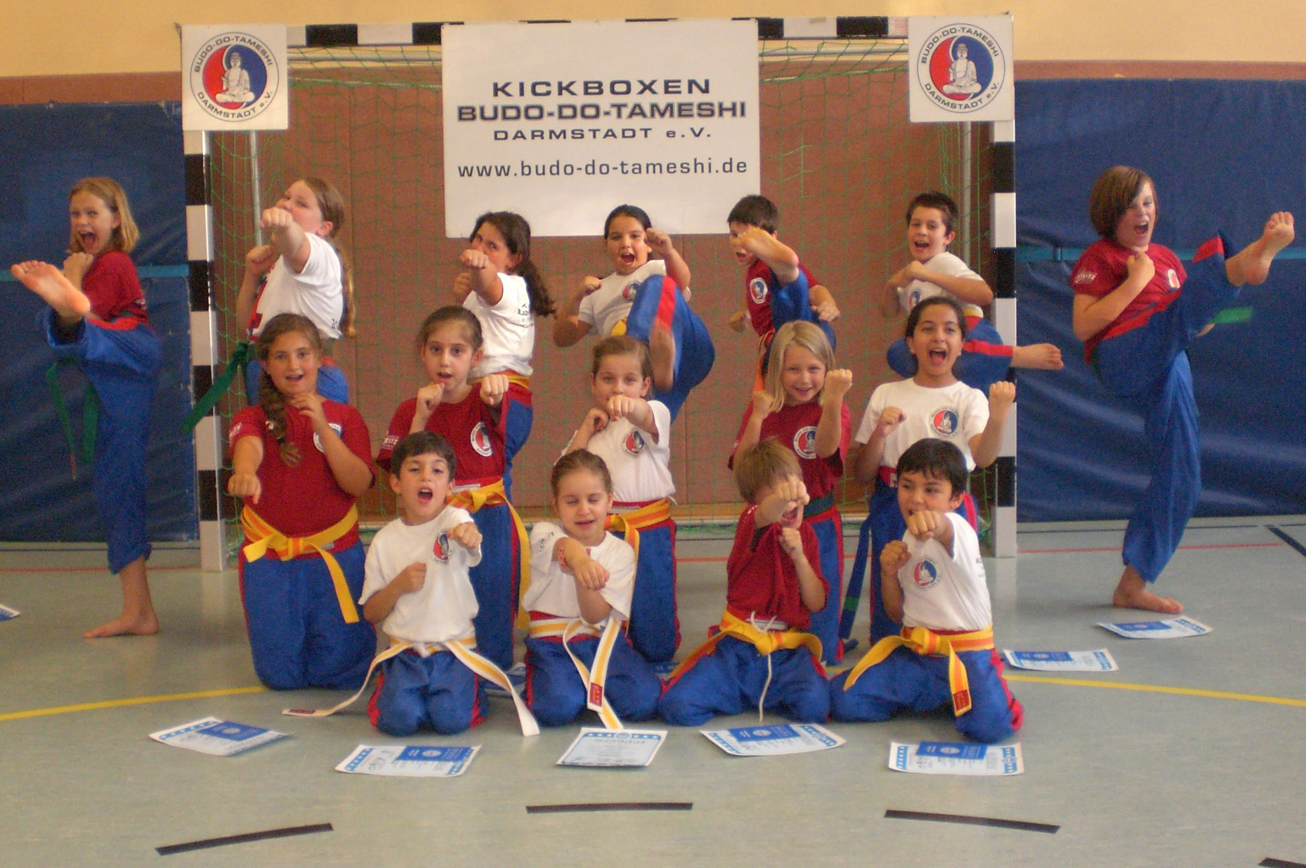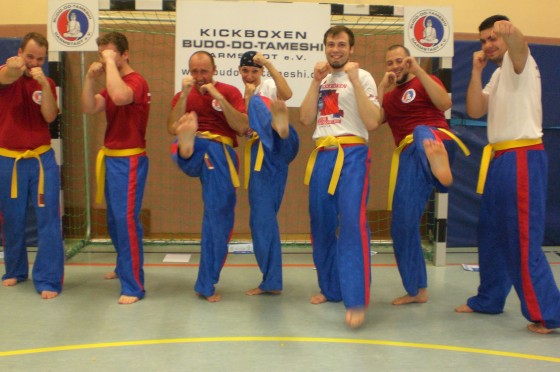 mit den dazugehörigen Abwehr- und Kontermöglichkeiten. Demonstriert wurden die Techniken mit und ohne Partner an der Pratze im Modellsparring und freien Sparring. Ebenfalls zum Prüfungsprogramm gehören verschiedene Übungen aus der Fallschule und Selbstverteidigung. Abgestuft nach Gürtelgraden wurde auch das theoretische Wissen der Sportler überprüft.